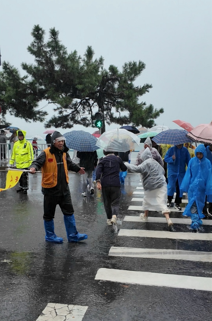 志愿者雨中引導(dǎo)交通
